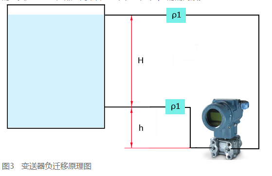 如圖3所示為負(fù)遷移的原理圖,如果差壓變送器的取壓室在運(yùn)用過程中,密閉容器內(nèi)的液體或者是氣體注入到取壓室中,那么測量管線就將會(huì)遭受很大程度的損害,甚至?xí)馐車?yán)重的腐蝕,為了密閉容器內(nèi)的液體或者氣體流竄。因此,將隔離罐分別安裝到了差壓變送器的正負(fù)壓室與取壓點(diǎn)之間,并且注入了密度為ρ1的隔離液。