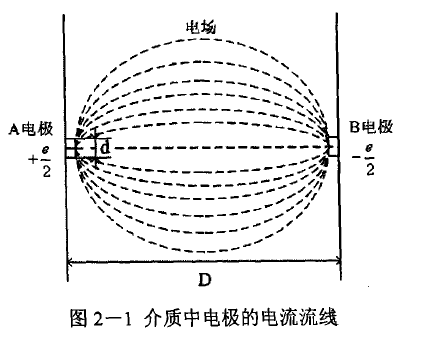 對于點(diǎn)電極的電磁流量計(jì)流量信號內(nèi)阻來說,如圖2-1所示,在絕緣襯里的傳感器測量管內(nèi)壁,裝有一對接液電極.電極是圓盤狀,直徑為d,電極A和電極B的距離(測量管直徑)為D(d<<D)。充滿導(dǎo)電液體的管道足夠長,電極所處介質(zhì)的電導(dǎo)率s和介電常數(shù)e是均質(zhì)的,對介質(zhì)內(nèi)的電流場不致有所改變。在這些假定條件下,電極實(shí)際上等于埋在各個(gè)方向具有無限深層的介質(zhì)內(nèi)。設(shè)兩電極間的電動(dòng)勢為e,A電極的電位為+e/2,B電極的電位為-e/2。從圖2-1可以看出,電流由A電極向介質(zhì)散流匯集于B電極流出。電流流動(dòng)時(shí)流過的截面在電極附近最小,以后離電極愈遠(yuǎn)愈大。也就是說離電極愈遠(yuǎn)電流密度愈小,因而電場強(qiáng)度也愈小。由此可見,在電流經(jīng)過的途徑每單位長度上,介質(zhì)對電流的電阻愈遠(yuǎn)愈?。@樣,在計(jì)算傳感器信號內(nèi)阻時(shí),可以暫把流體的體電阻視為零,僅計(jì)算兩電極與介質(zhì)相接觸的接觸電阻。