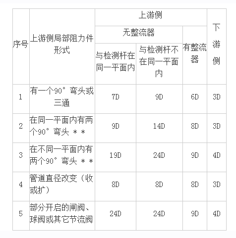 1、安裝檢測(cè)桿的測(cè)量段應(yīng)是直的,其上下游直管段長(zhǎng)度參照下表所規(guī)定的長(zhǎng)度,序號(hào)上游側(cè)局部阻力件形式上游側(cè)下。